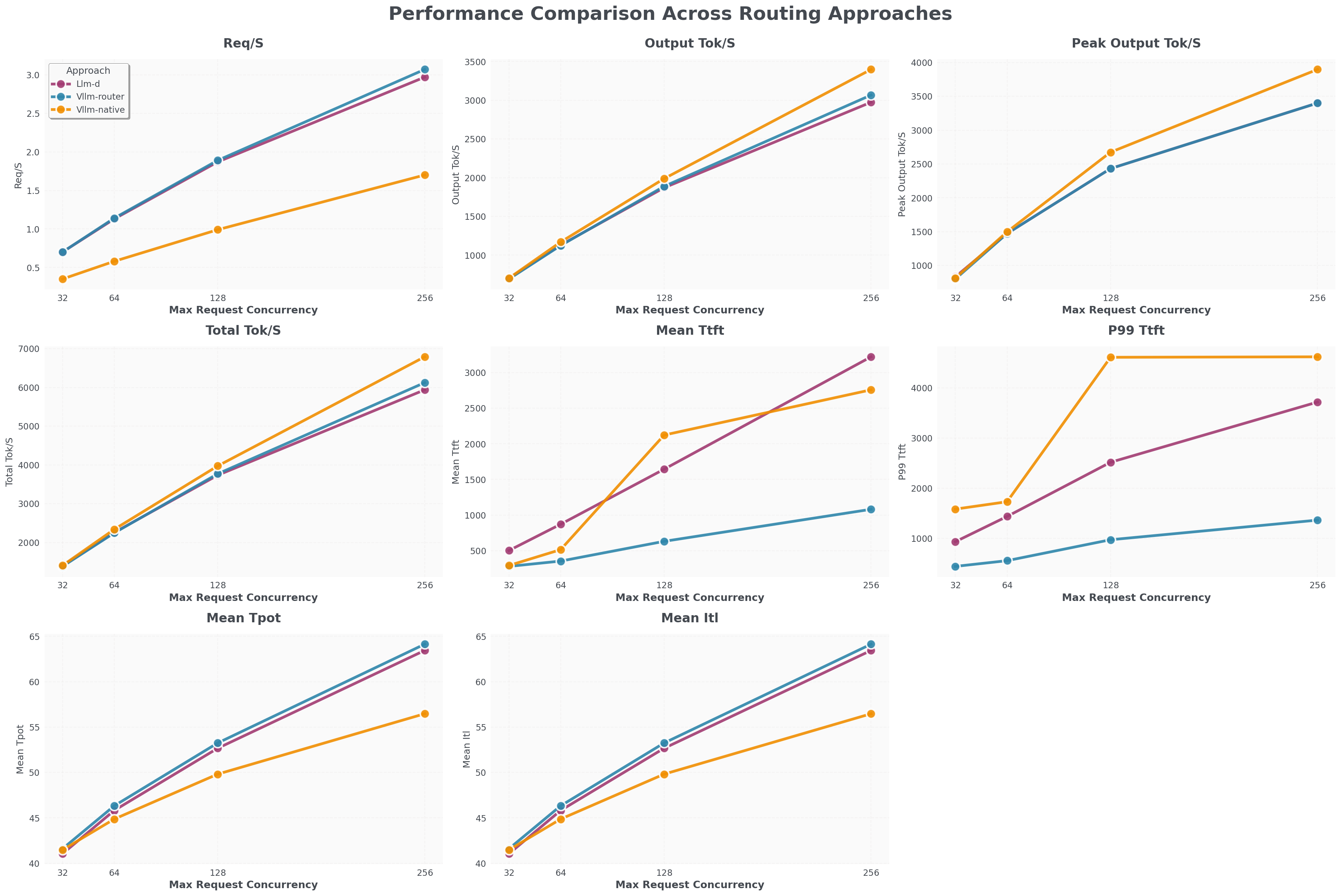 - vLLM Router (blue line) Req/S throughput is 25% higher than llm-d (purple line) and 100% higher than K8s-native load balancer (orange line).